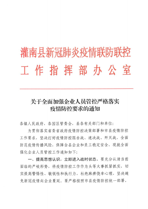 關(guān)于全面落實(shí)疫情防控要求強(qiáng)化企業(yè)人員管控的通知