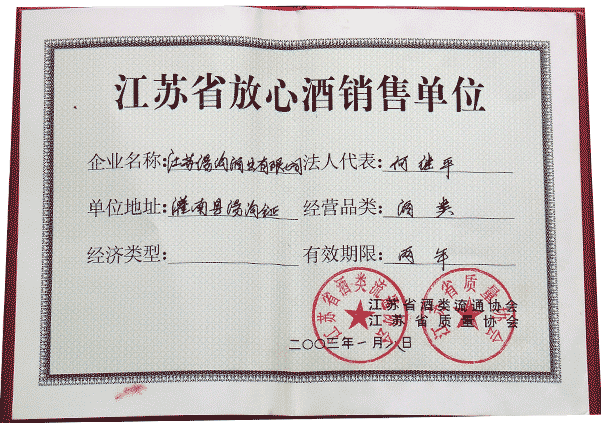 湯溝酒業(yè)榮獲—江蘇省放心酒銷售單位證書