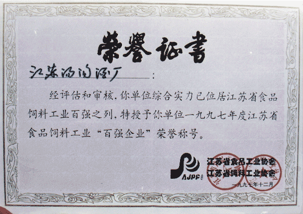 獎項名稱:湯溝酒業(yè)榮獲—江蘇省食品飼料工業(yè)百強(qiáng)企業(yè)榮譽(yù)證書
