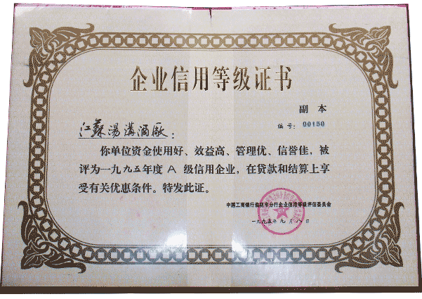 湯溝酒業(yè)榮獲—企業(yè)信用等級證書