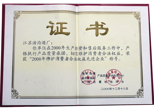獎(jiǎng)項(xiàng)名稱:湯溝酒業(yè)榮獲—2000年維護(hù)消費(fèi)者合法權(quán)益先進(jìn)企業(yè)稱號