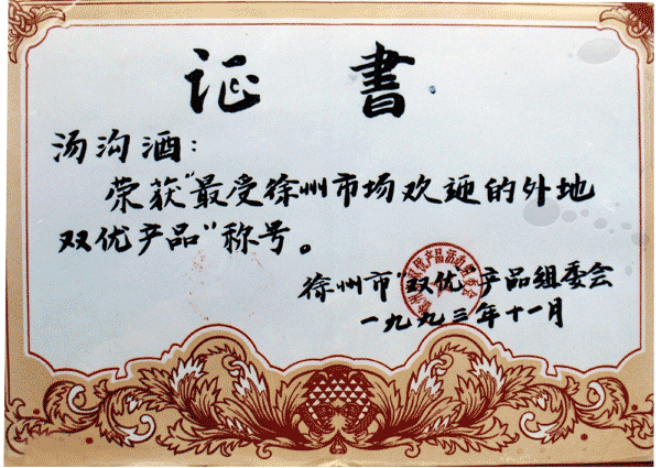 獎項名稱:湯溝酒業(yè)榮獲—受徐州市場歡迎的外地雙優(yōu)產(chǎn)品